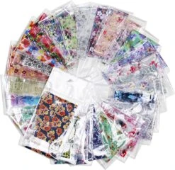 Een nagelfolie set van 30 willekeurige designs met voornamelijk bloemen.